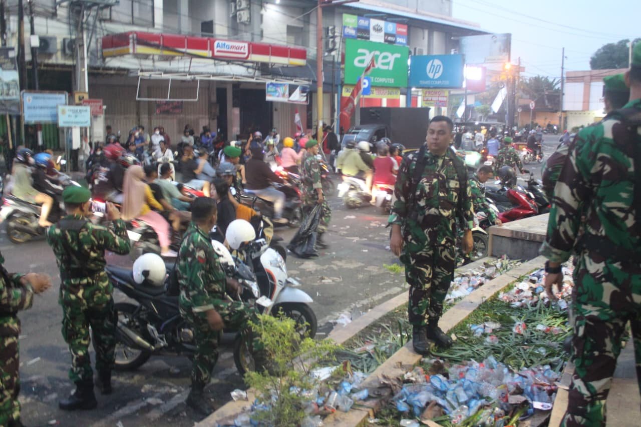 Pati – Tak hanya mengamankan jalannya aksi, para personel TNI Kodim 0718/Pati berjibaku bersama warga membersihkan sampah yang berserakan di lokasi pasca aksi unjuk rasa yang digelar di sekitar Alun-Alun Pati pada Kamis (14/8/2025).