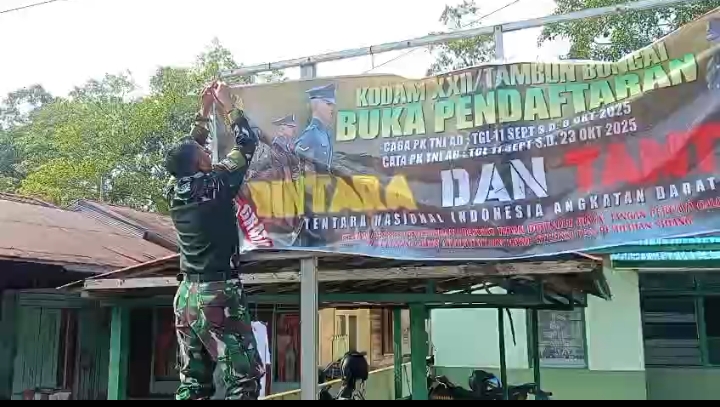 BARABAI – Kodim 1002/Hulu Sungai Tengah (HST) melalui jajaran Koramil melaksanakan pemasangan spanduk rekrutmen Prajurit TNI untuk Tamtama dan Bintara PK Tahun Anggaran 2025, Jumat (26/9).