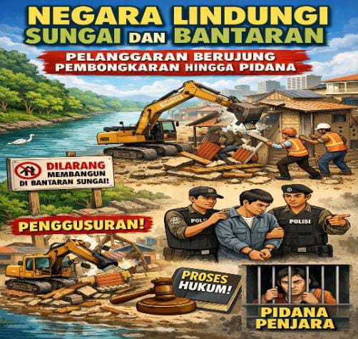 **Patrolihukum.net** – Pemerintah kembali mengingatkan masyarakat agar berhati-hati dalam mendirikan bangunan di sekitar sungai. Sungai beserta bantaran di sekitarnya merupakan kawasan yang **dilindungi negara**, sehingga pemanfaatannya tidak bisa dilakukan secara sembarangan. Pelanggaran terhadap aturan tersebut tidak hanya berisiko menimbulkan bencana, tetapi juga dapat berujung pada **sanksi administratif hingga pidana**.