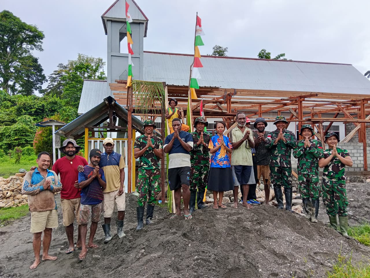 Masyarakat Kp. Naikere dengan penuh antusias, bahu-membahu bergotong royong bersama-sama dengan anggota Satgas Yonif 410/Alugoro dalam pembangunan gereja yang baru pertama kali dibangun di kampung tersebut.