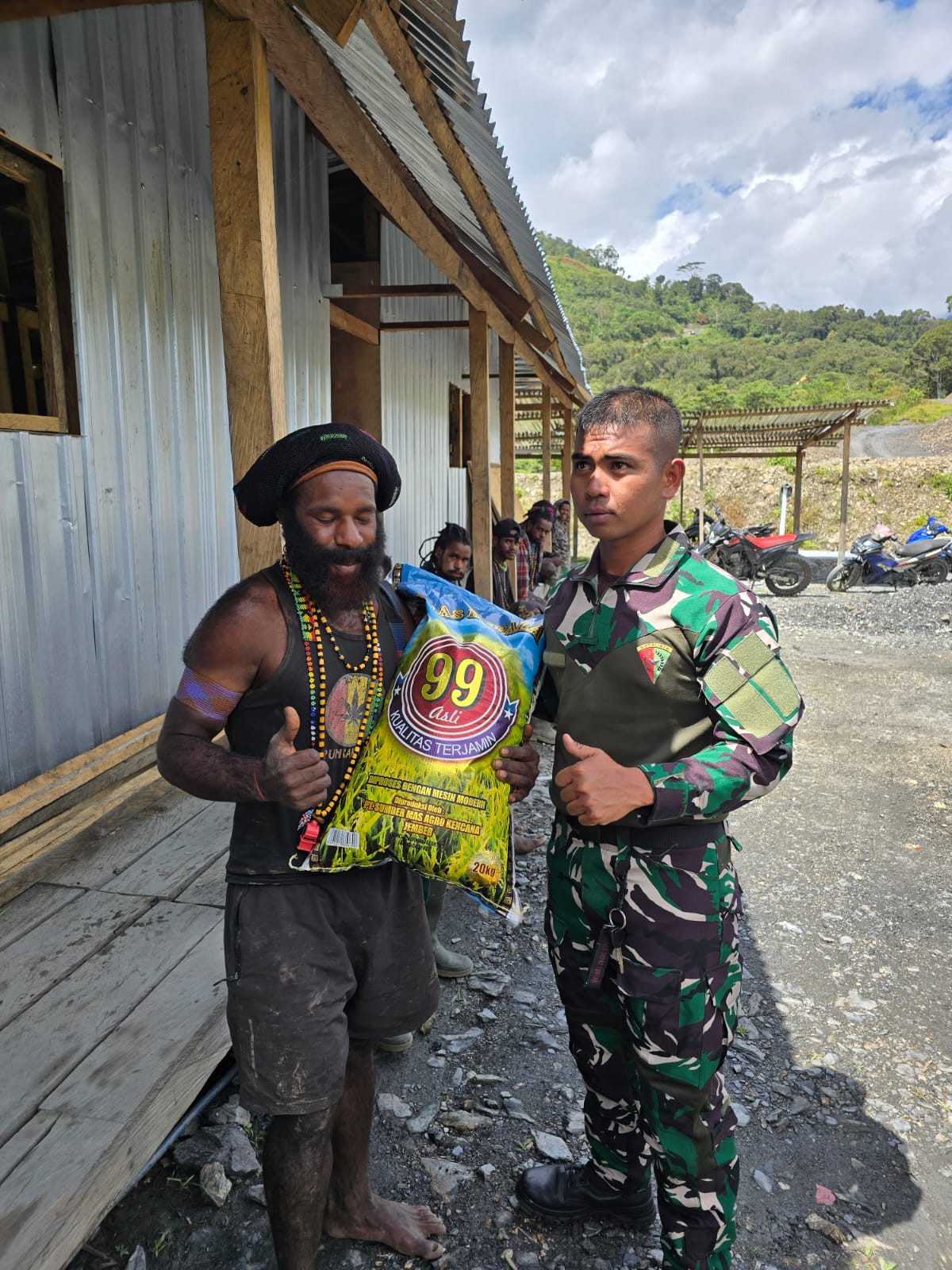 Salah satu warga Bapak Lendison Enumbi (34) mengucapkan syukur atas bantuan berasnya lepas keluarganya “wa…wa…. Terimakasih Bapak sudah kasih bahan makan pa tong dsni, ini sangat berarti bagi sa dan kluarga,, berkat berlimpah kepada bapak smua”. (Pen Satgas Yonif 715/Mtl)